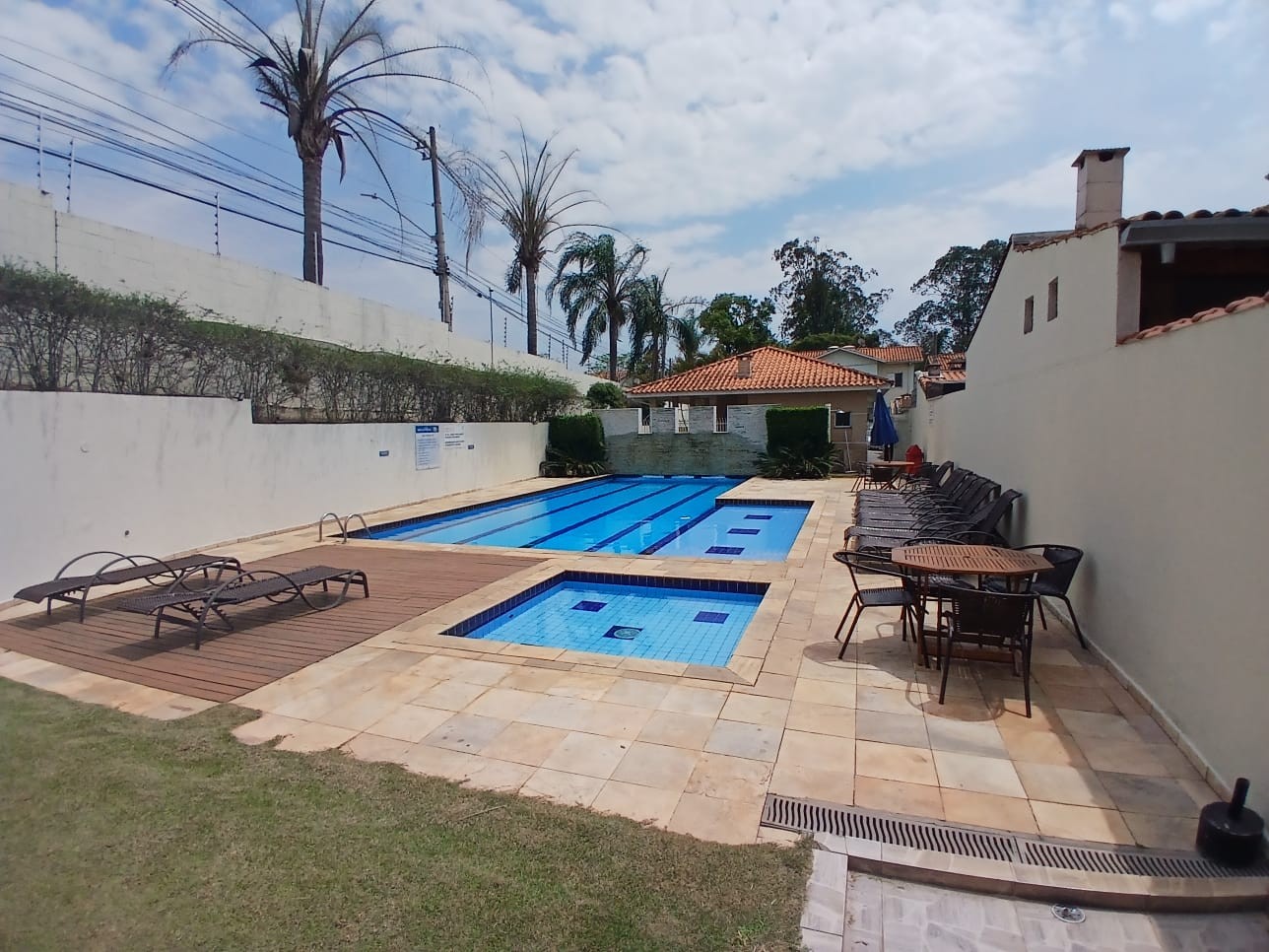 Condomínio com portaria 24h e área de lazer completa: piscinas, quadra esportiva, playground e salão de festas com churrasqueira.